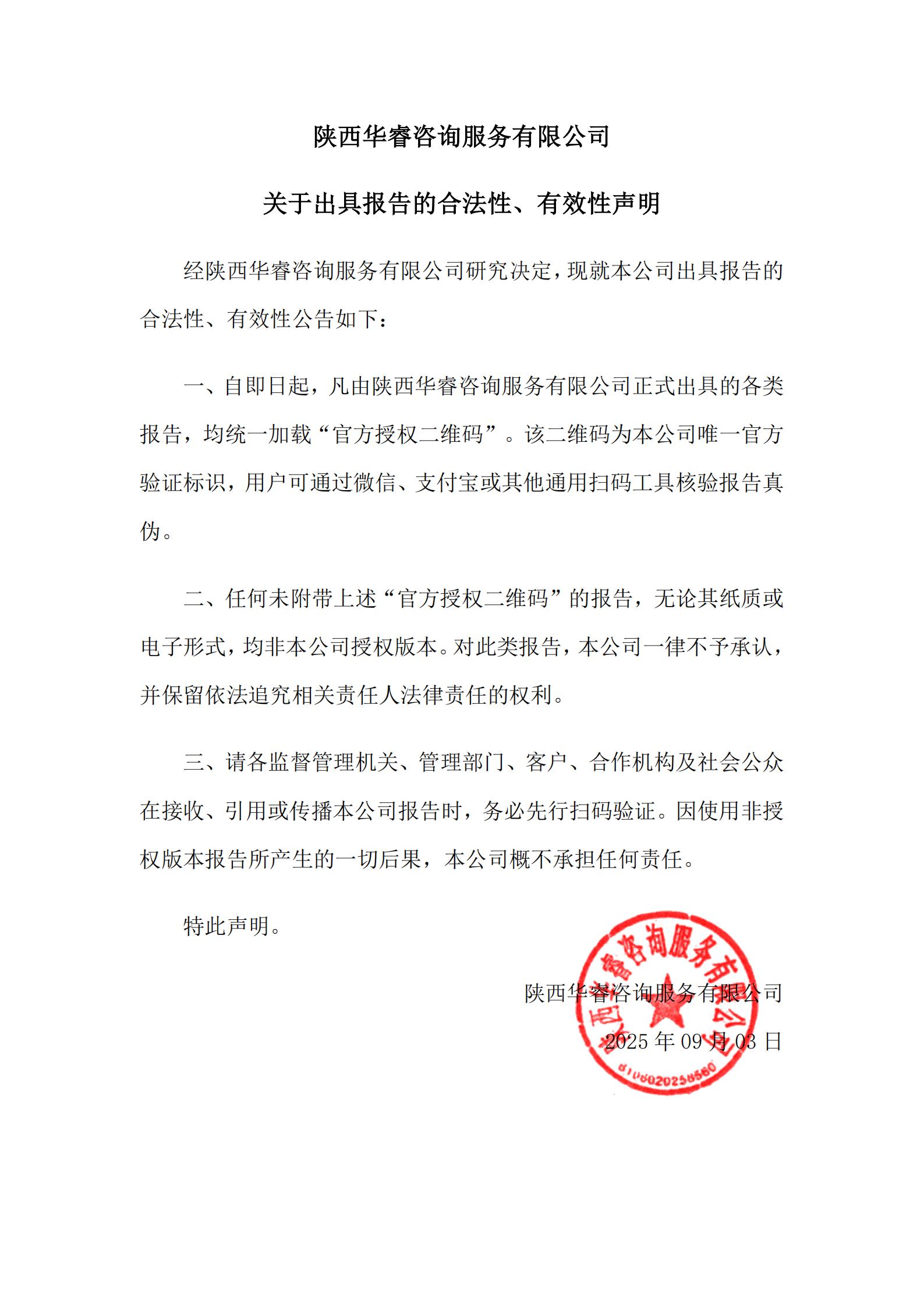 陕西华睿咨询服务有限公司-关于出具报告的合法性、有效性声明